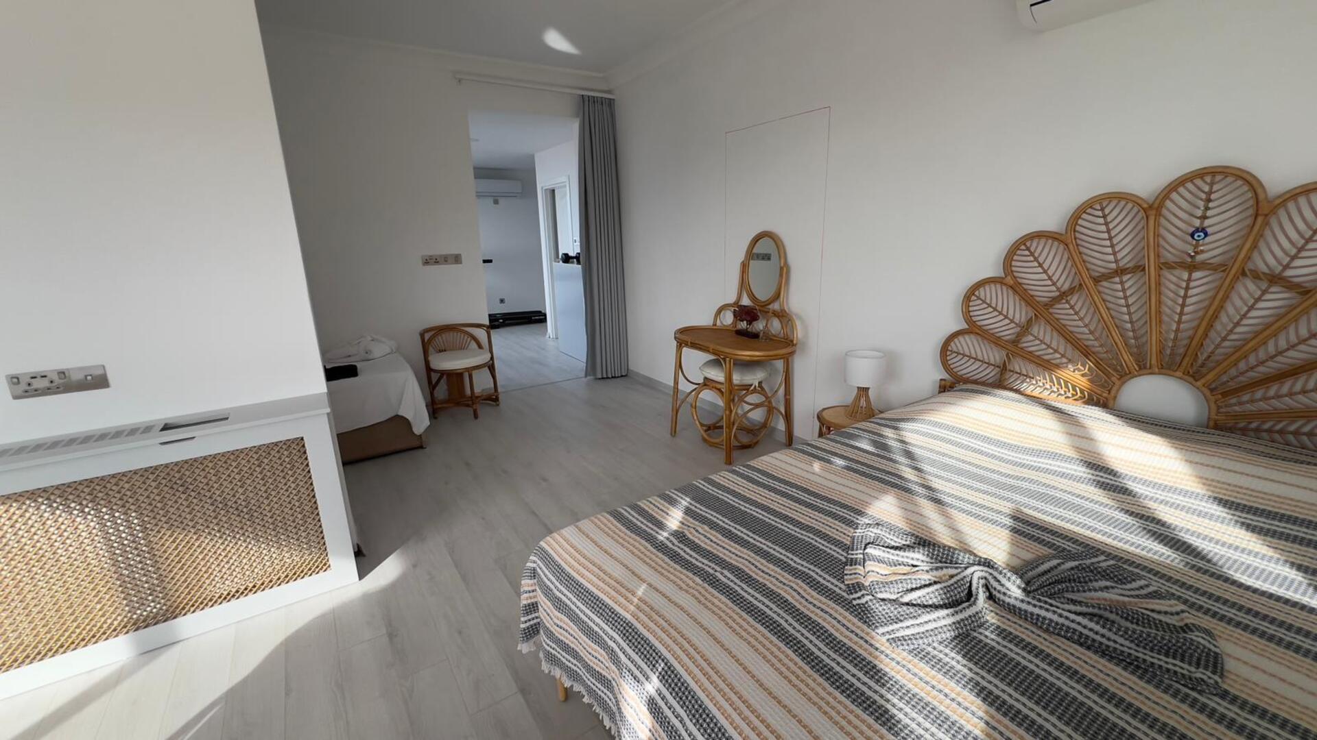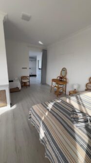 Das Erdgeschoss umfasst auch ein Hauptschlafzimmer mit eigenem Balkon, ein weiteres Schlafzimmer sowie ein Badezimmer mit Dusche. Der oberste Stock bietet ein weiteres geräumiges Schlafzimmer, eine Miniküche und eine beeindruckende Terrasse mit Panoramablick auf das Meer - der ideale Ort, um die Sonnenuntergänge zu beobachten.